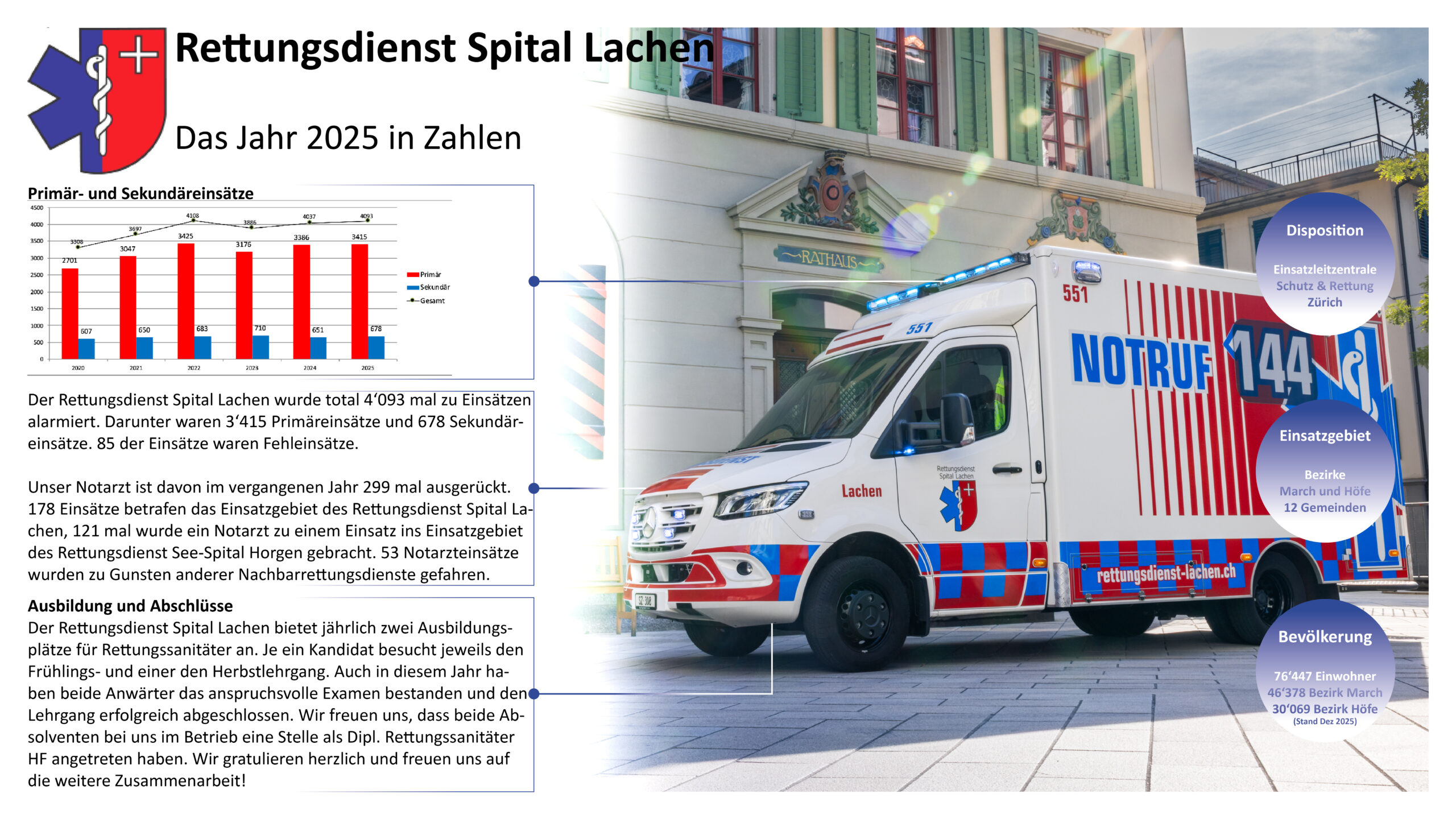 Jährlich publiziert der Rettungsdienst Spital Lachen einen Jahresbericht. Stöbern Sie in den alten Zahlen oder informieren Sie sich über den neusten Stand.